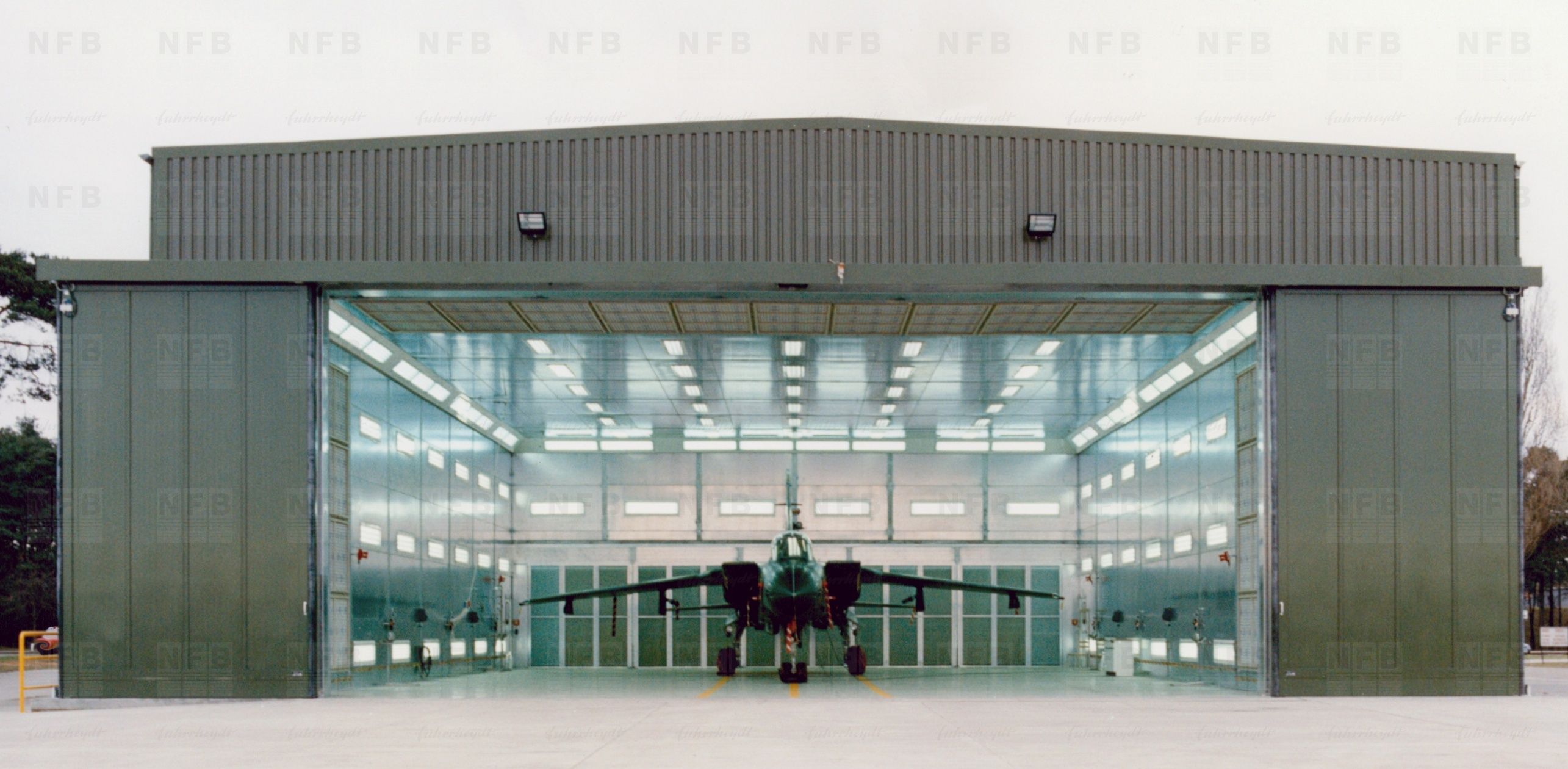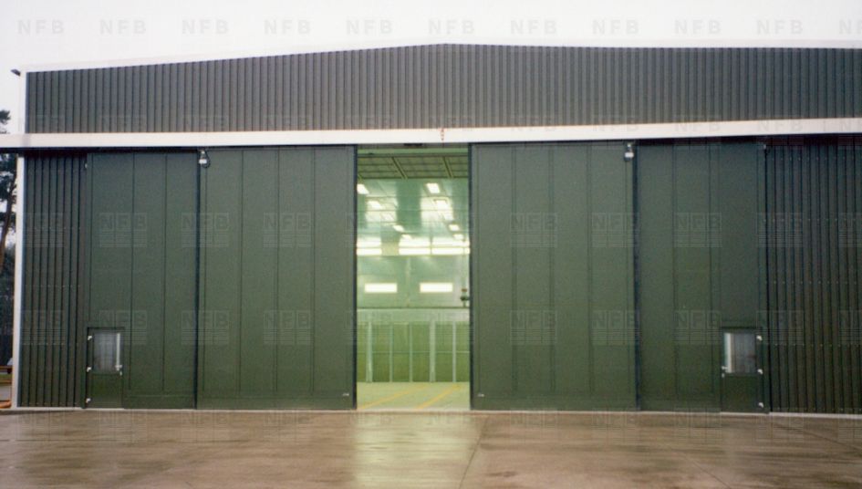 Die Toranlage ist für einen NATO-Stützpunkt ausgeführt als Teleskop-Hangar-Schiebetor in den Maßen 15,4 x 6,5 m (Spritzkabinen-Hangar).