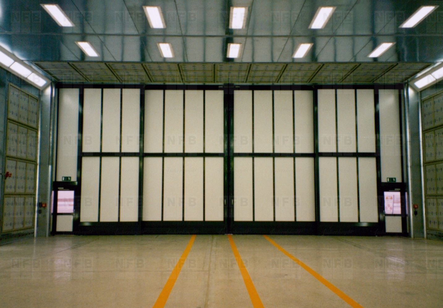 Die Tore bewegen sich in vier Segmenten übereinanderschiebend, mittig geteilt, zur linken und zur rechten Seite. Das Tor ist doppelwandig ausgeführt als isolierte Einheit und abgeschlossen mit doppelten Neopren-Dichtungen, um den Auslass von Farbnebel zu vermeiden. Das Tor wurde gemäss Kundenvorgabe so konstruiert, dass Demontage und Wiederaufbau jederzeit möglich sind.
